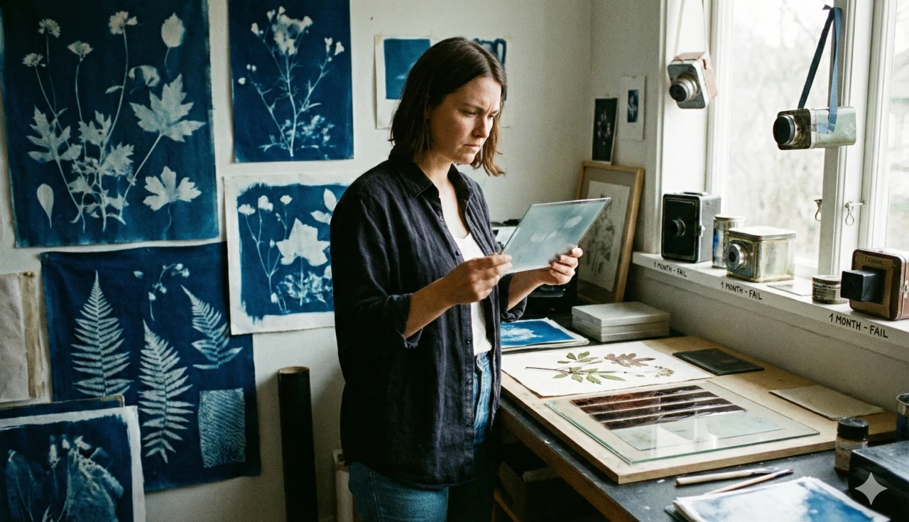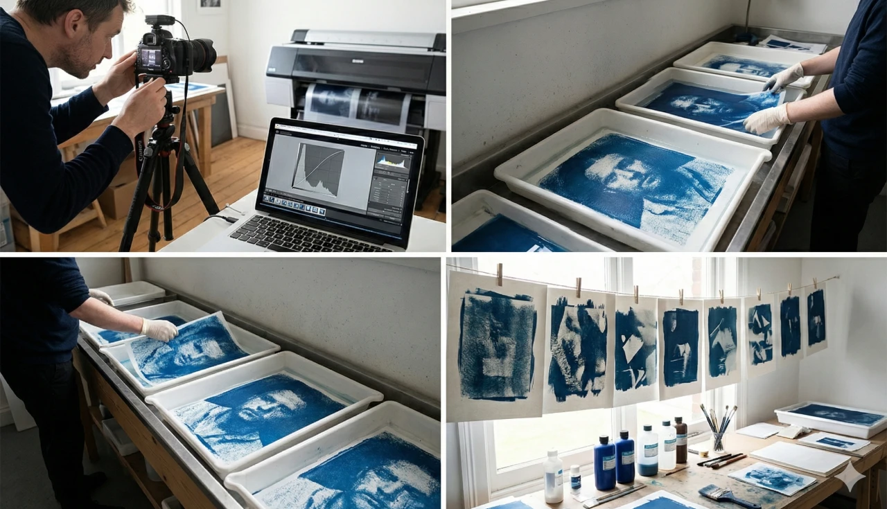 Como um fotógrafo calibra câmera digital e manipula grão para obter cyanotypes expressivos, com técnicas de ruído, Threshold e tonificação.