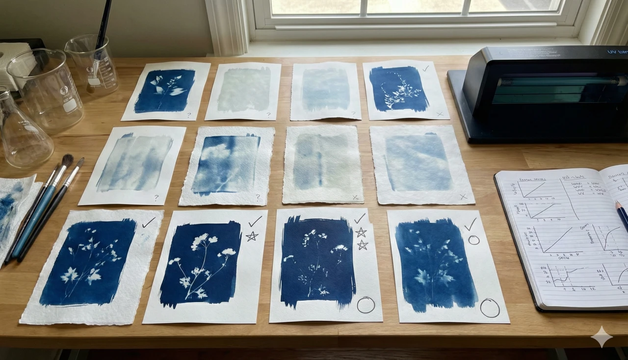 Resumo da pesquisa de Christina Z. Anderson com 100+ papéis testados, listas de papéis confiáveis e dicas práticas para obter cyanotypes estáveis e de alta qualidade.